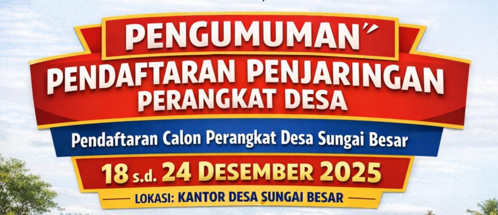 Pemerintah Desa Sungai Besar, Kecamatan Matan Hilir Selatan, Kabupaten Ketapang, resmi melaksanakan kegiatan penjaringan dan penyaringan perangkat desa yang berlangsung pada 18 hingga 24 Desember 2025. Seluruh rangkaian kegiatan dilaksanakan di Kantor Desa Sungai Besar.